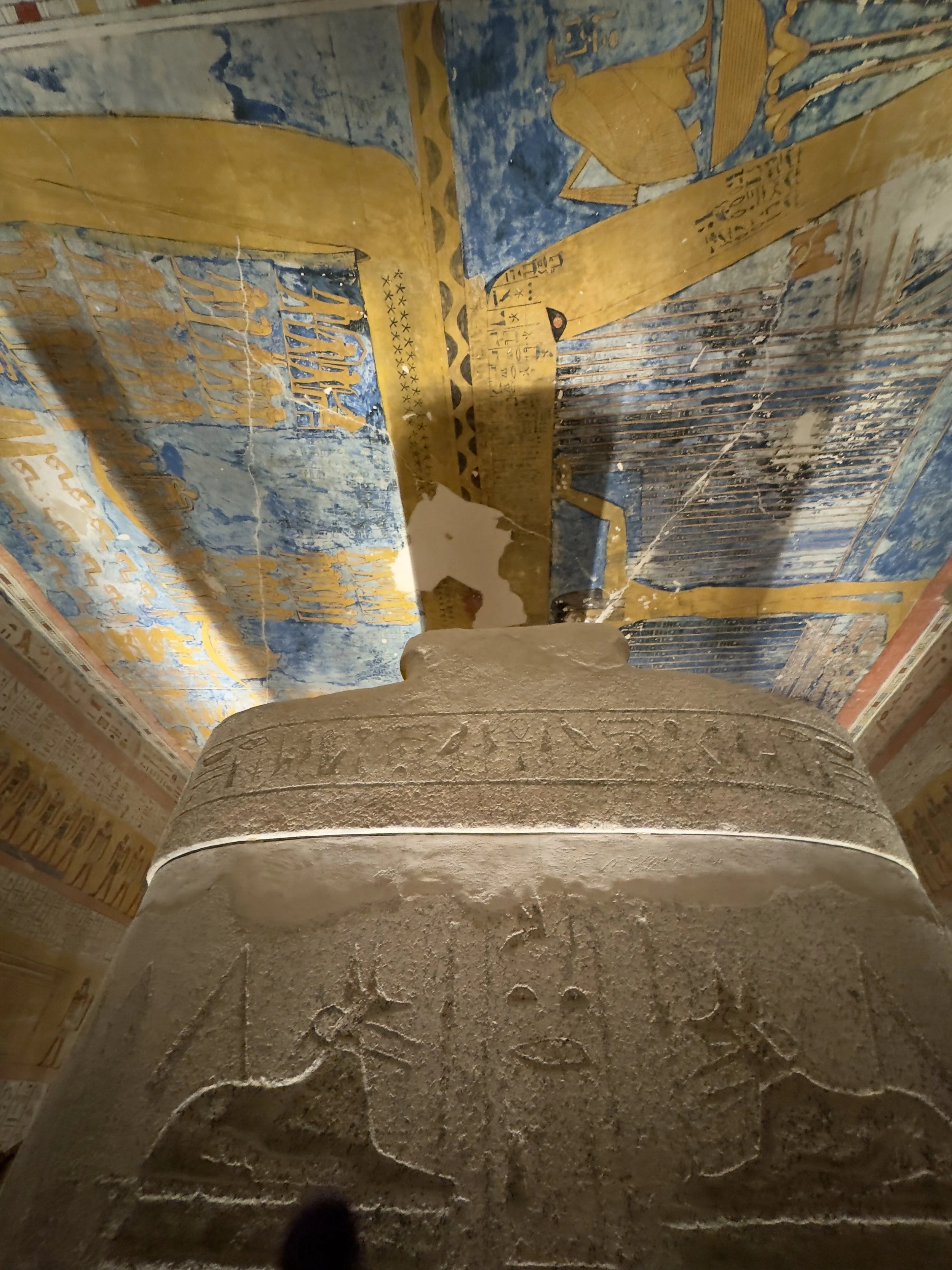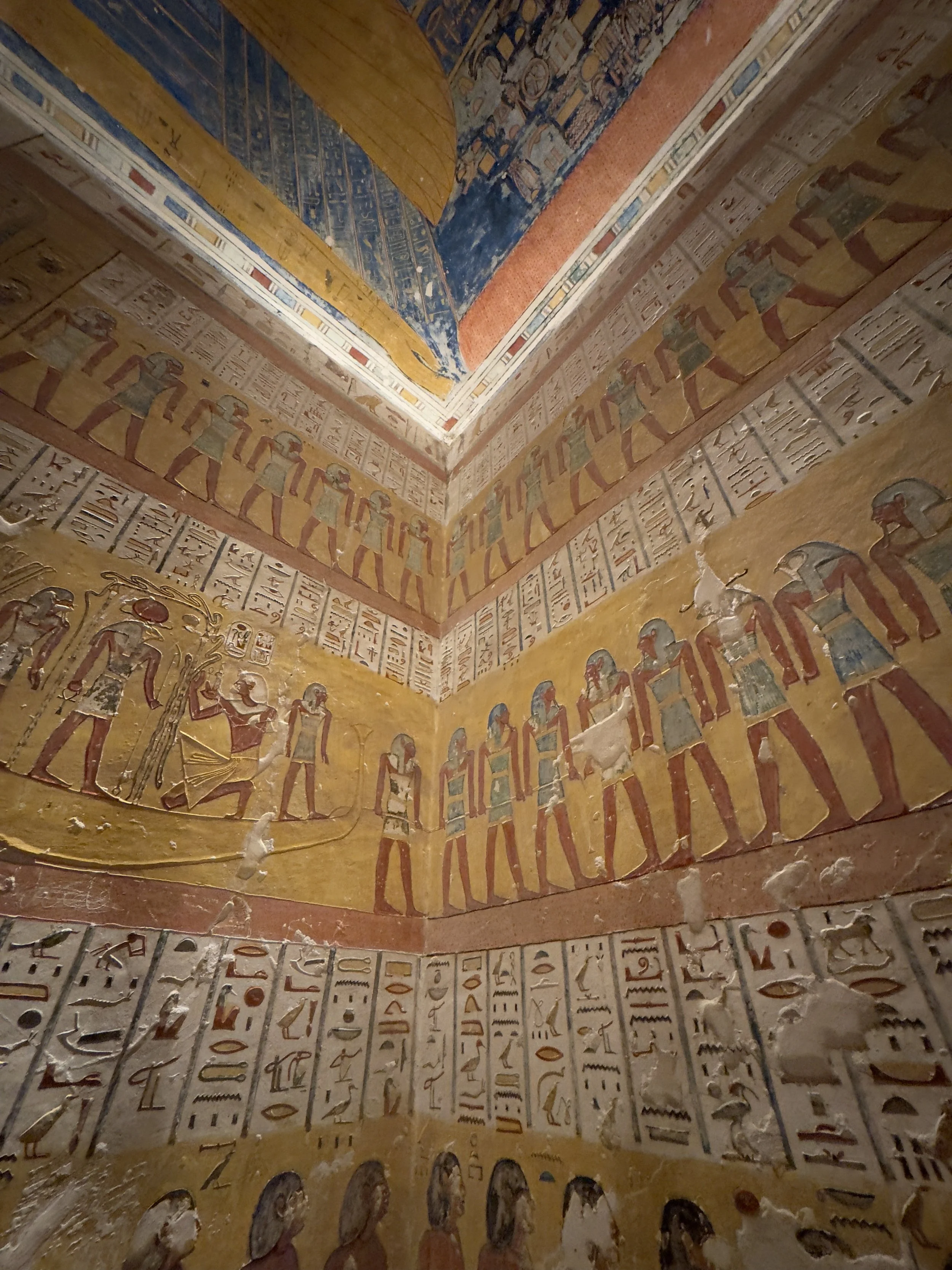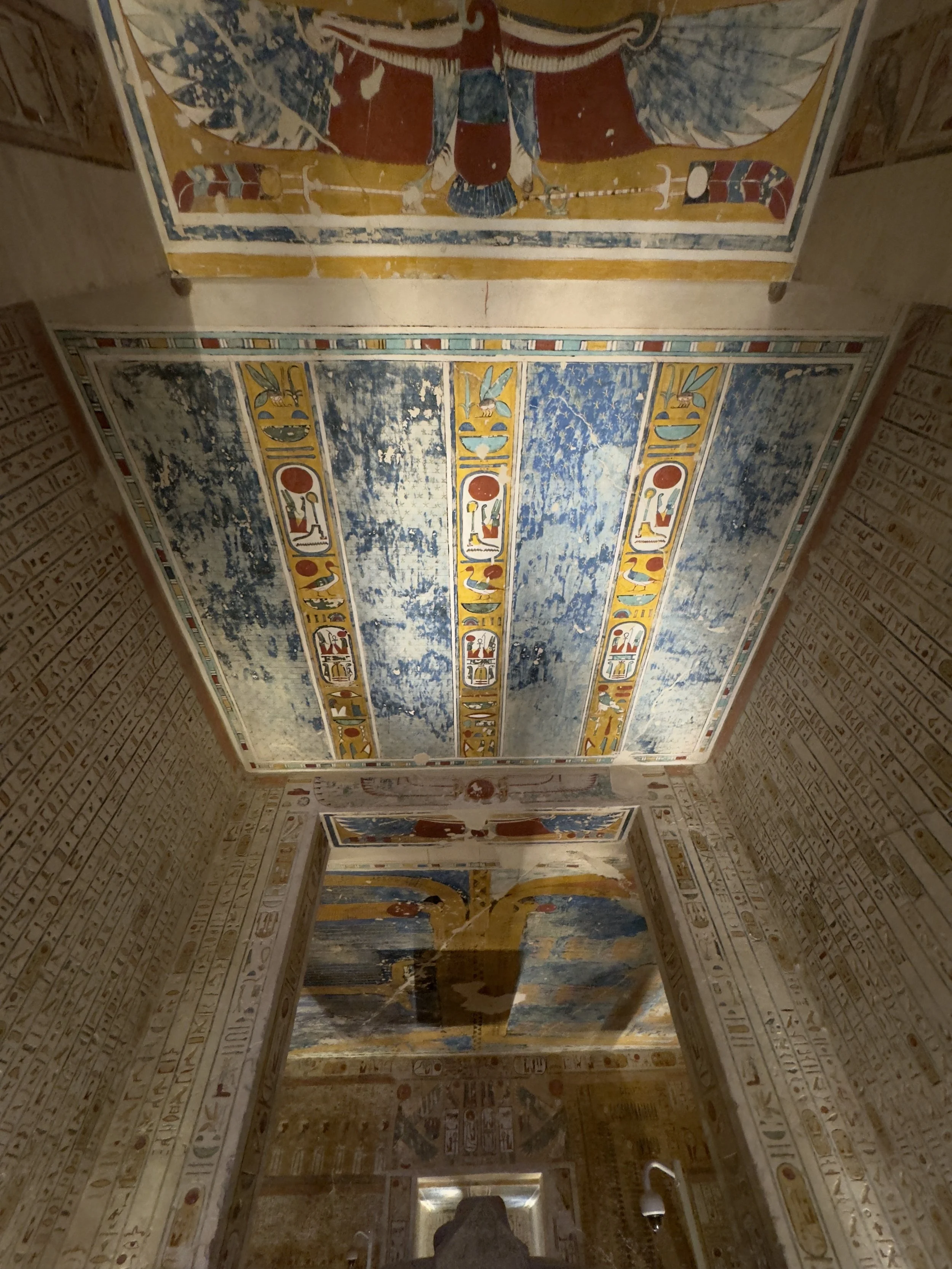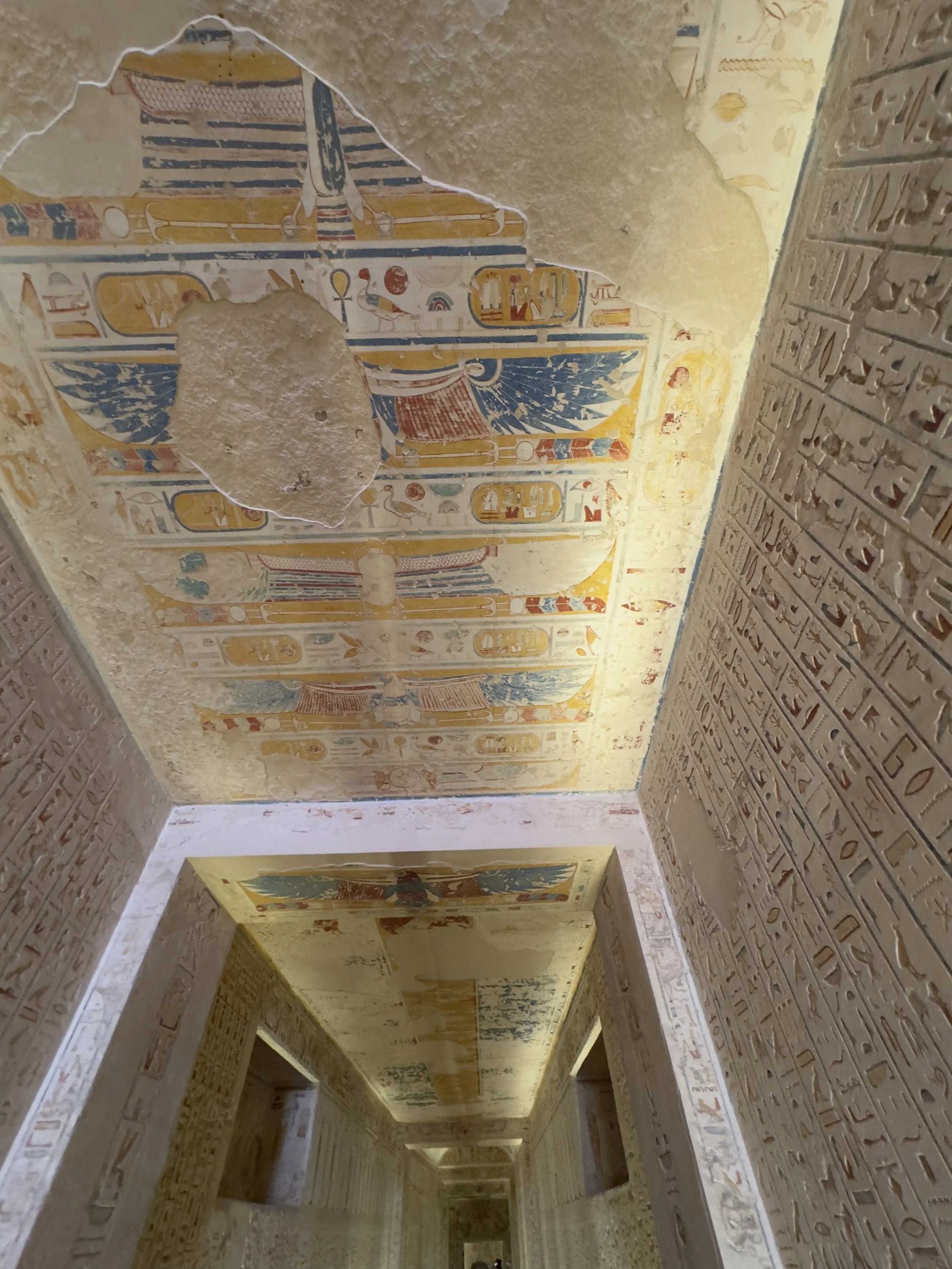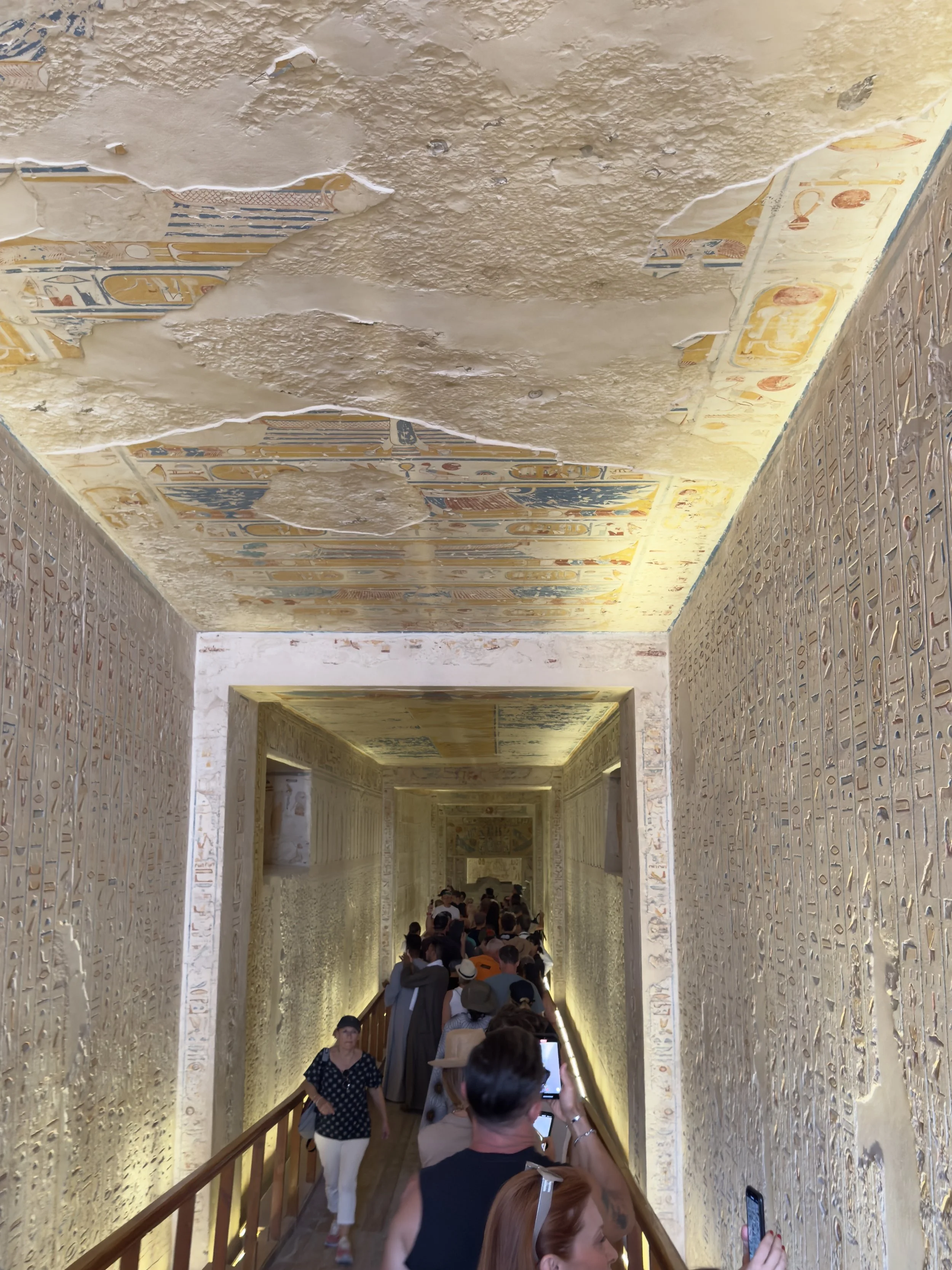 We hiked into the area, and the first Tomb we entered was that of the great Ramesses IV. The amount of color and detail in this tomb was breathtaking. So far, we have not seen anything quite like this with as much detail and preservation. You walk down a big hallway and enter the room with the tomb, which is covered in hieroglyphs of all the gods because of the significance of the Pharaoh. It was very crowded as it is one of the most popular sites in the Valley of the Kings.