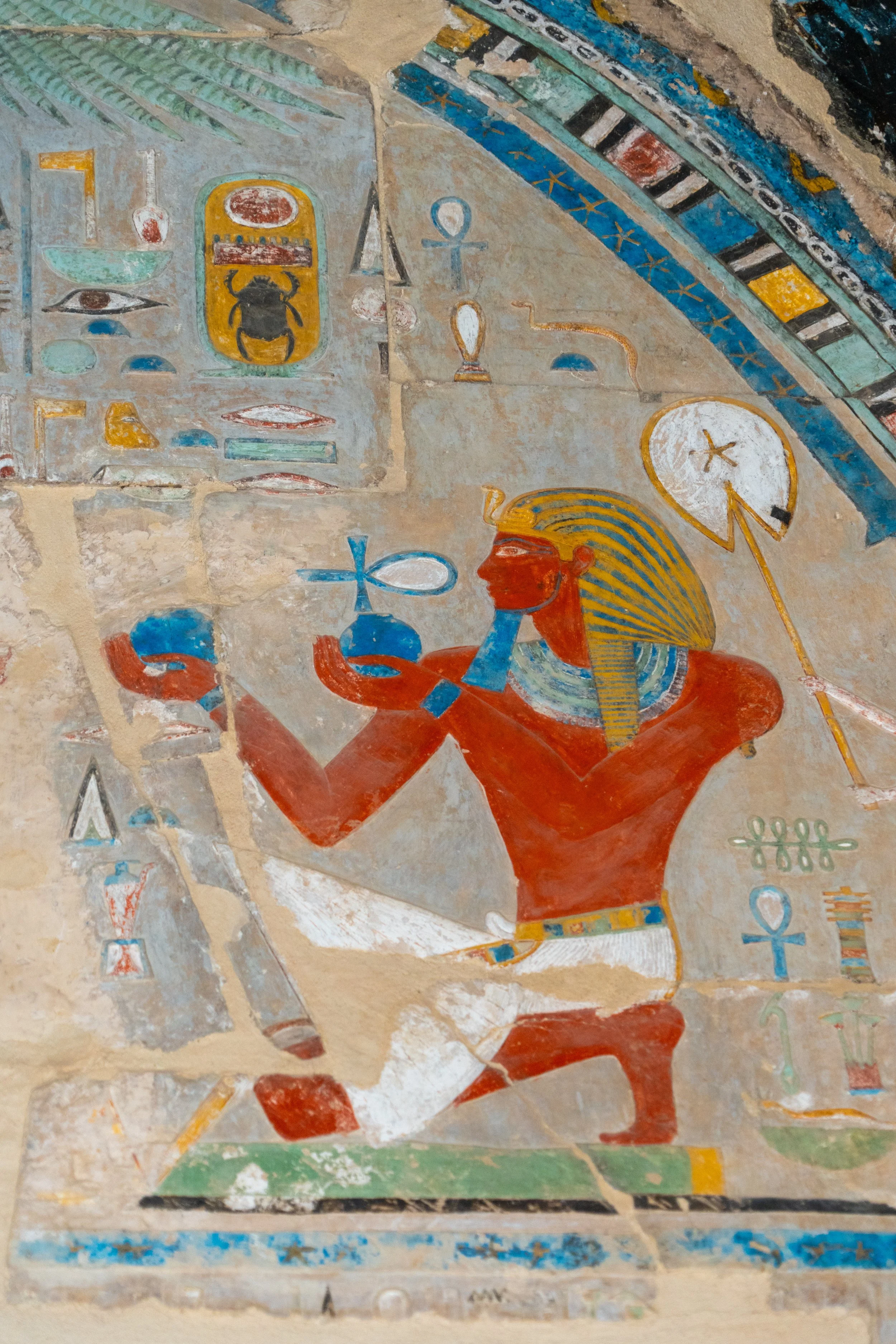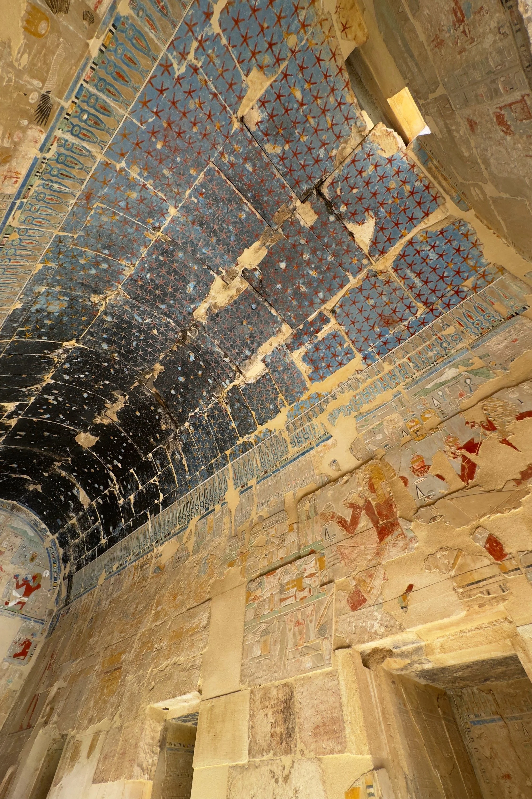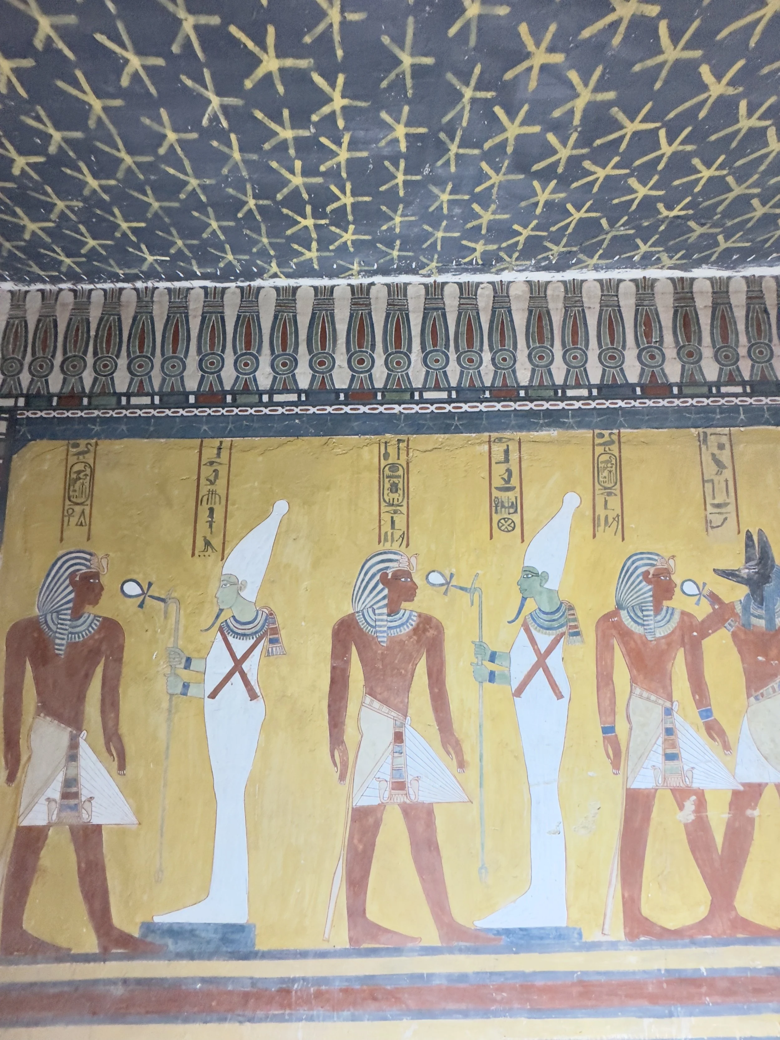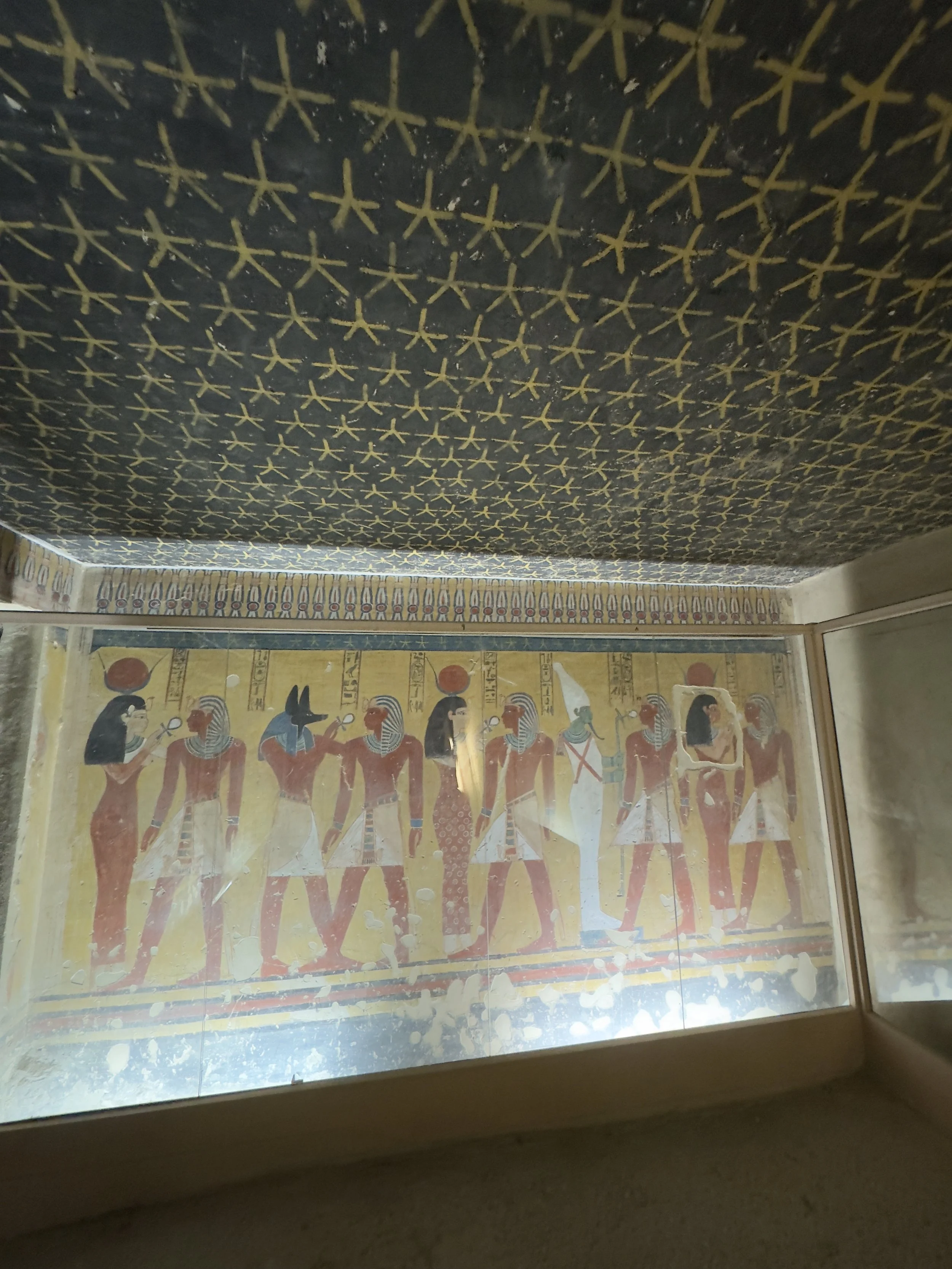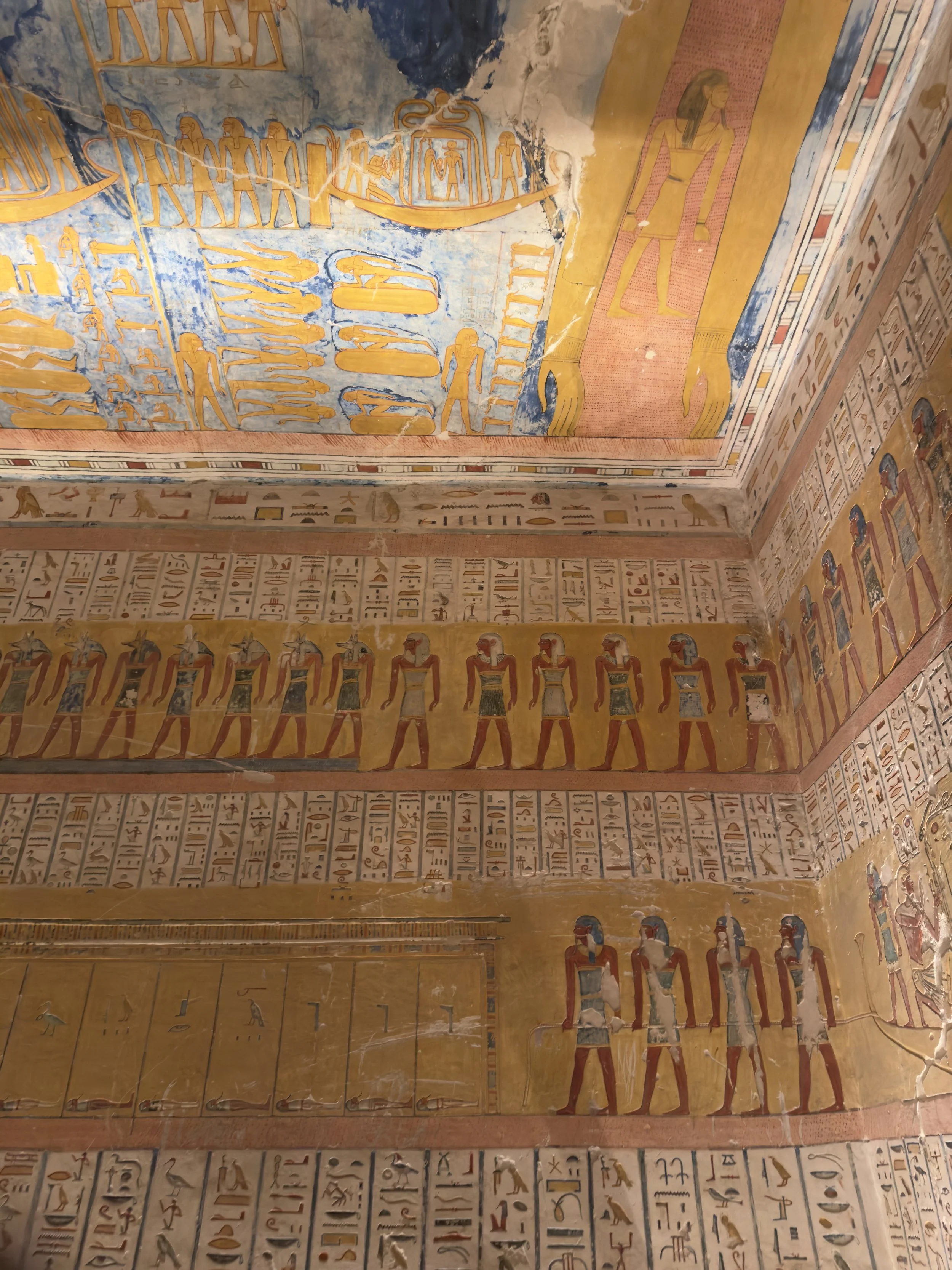 We hiked into the area, and the first Tomb we entered was that of the great Ramesses IV. The amount of color and detail in this tomb was breathtaking. So far, we have not seen anything quite like this with as much detail and preservation. You walk down a big hallway and enter the room with the tomb, which is covered in hieroglyphs of all the gods because of the significance of the Pharaoh. It was very crowded as it is one of the most popular sites in the Valley of the Kings.