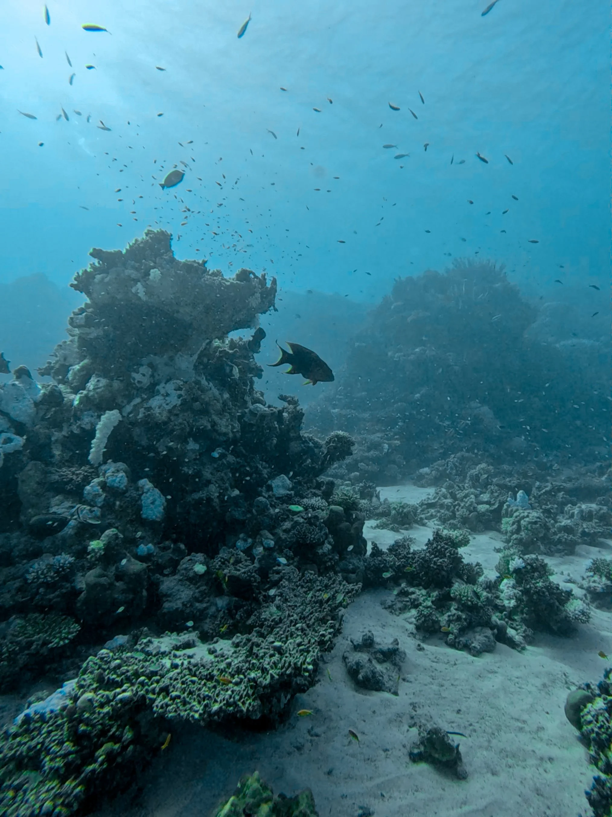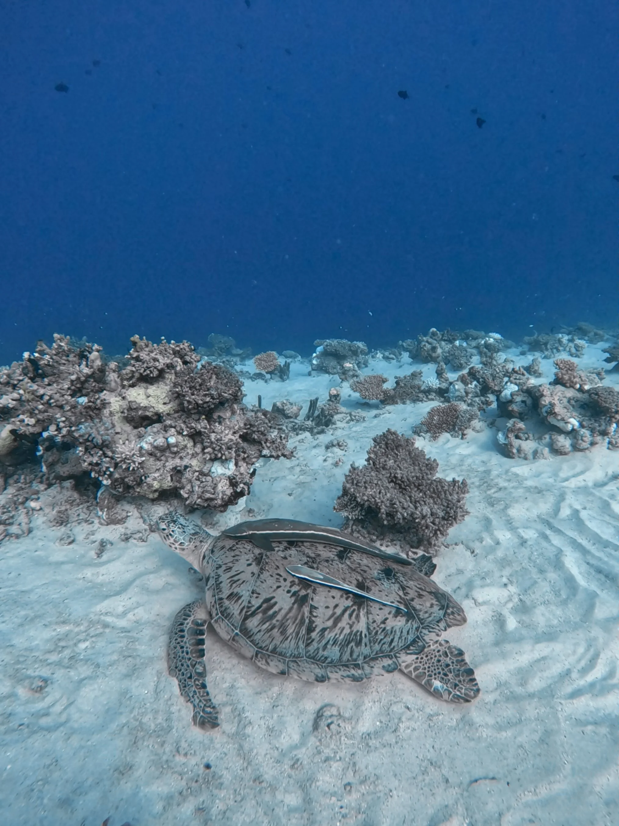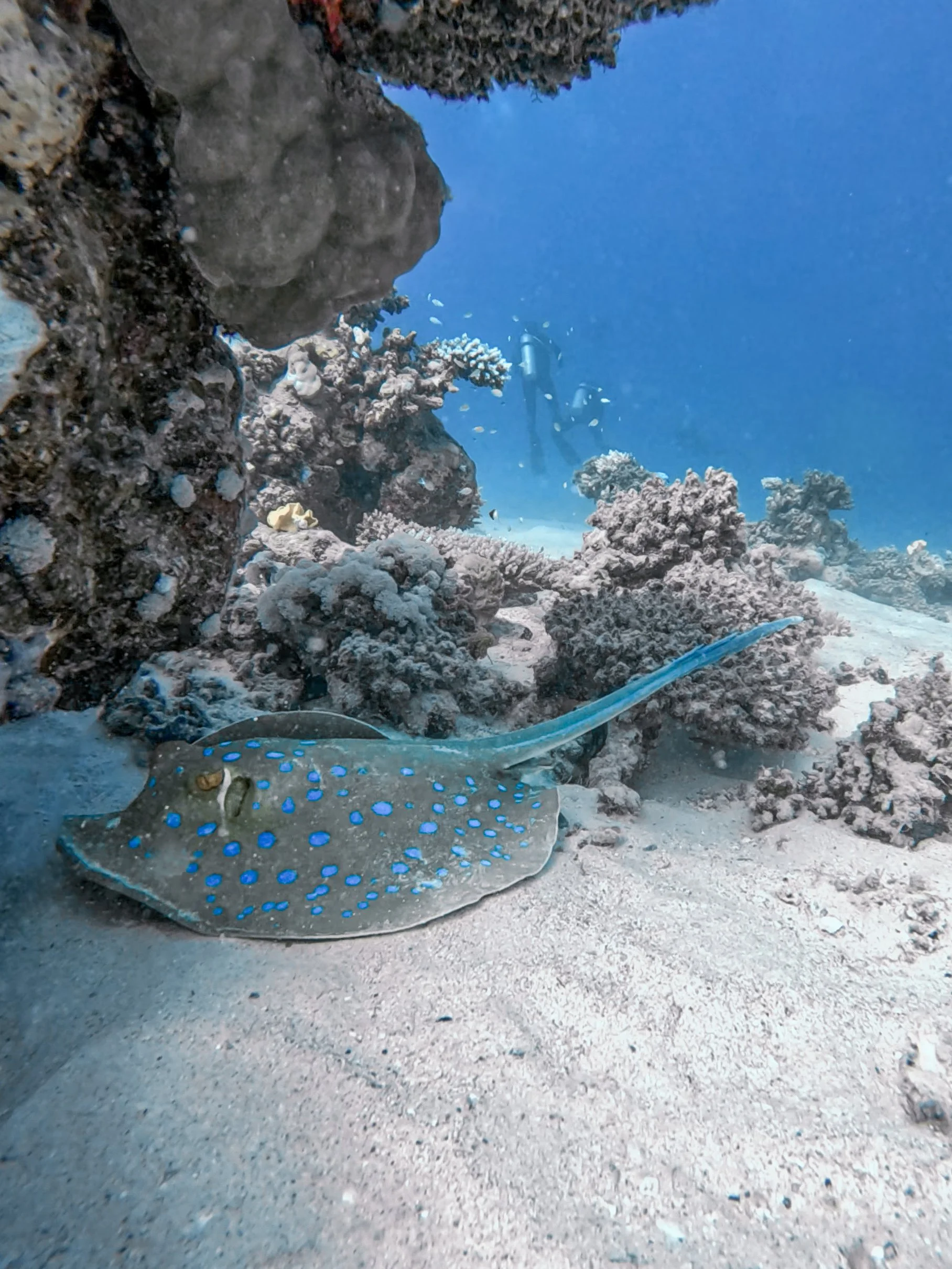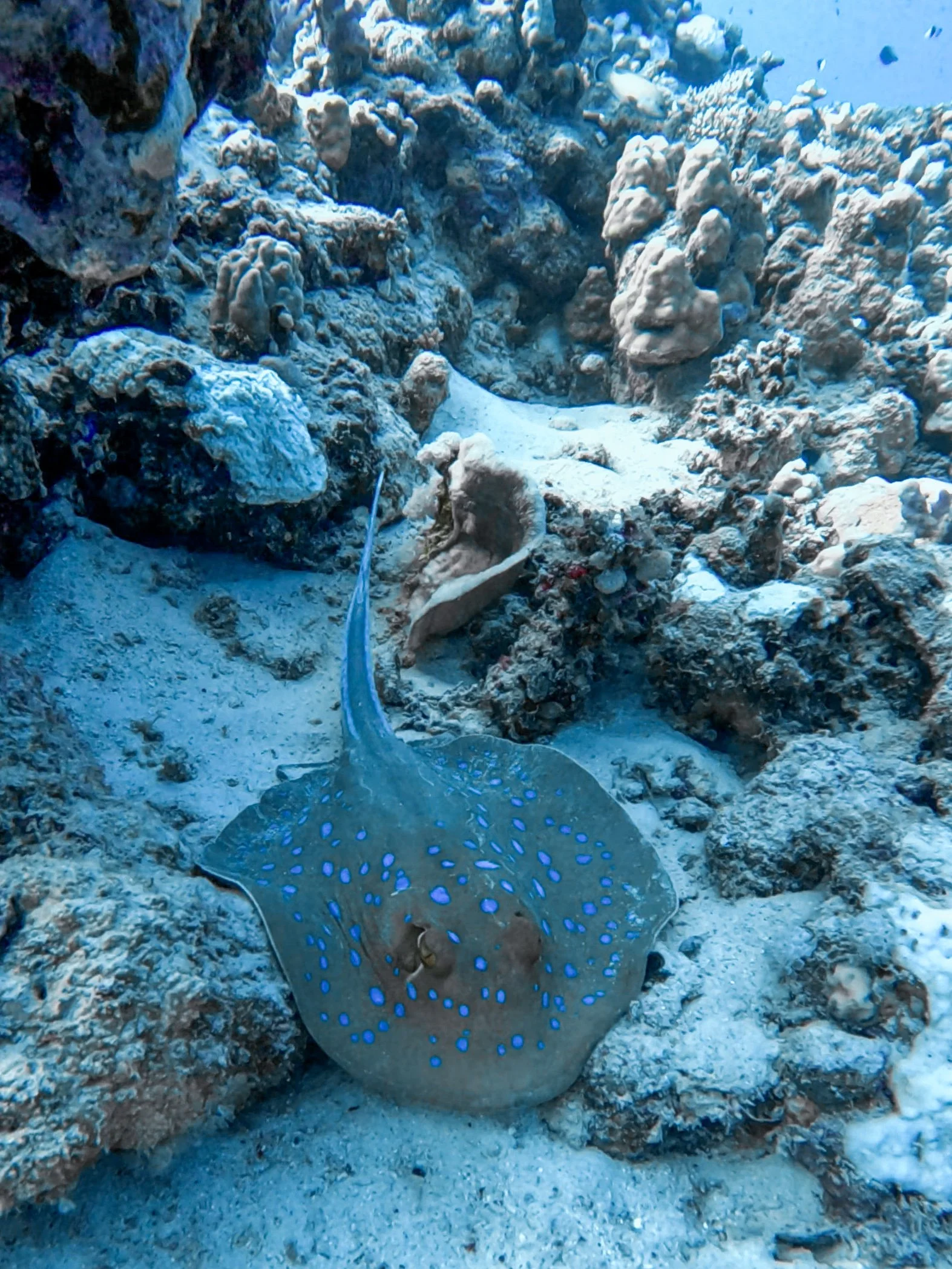I woke up early today to get all my dive gear and do a check. Unfortunately, due to the wind and current at the time, my dive was canceled. I was told we would be able to go out the next morning. All the trips that were supposed to go out in the morning were also canceled due to the swells, and you could even look out and see that the liveaboards near the dive sites were struggling. I had no desire to be on one of those boats. In the afternoon, I was able to go out on a dingy with other divers who had just shown up. We descended into the water and found an ancient green sea turtle, blue spotted stingrays, and the same fish I was seeing in Saudi.