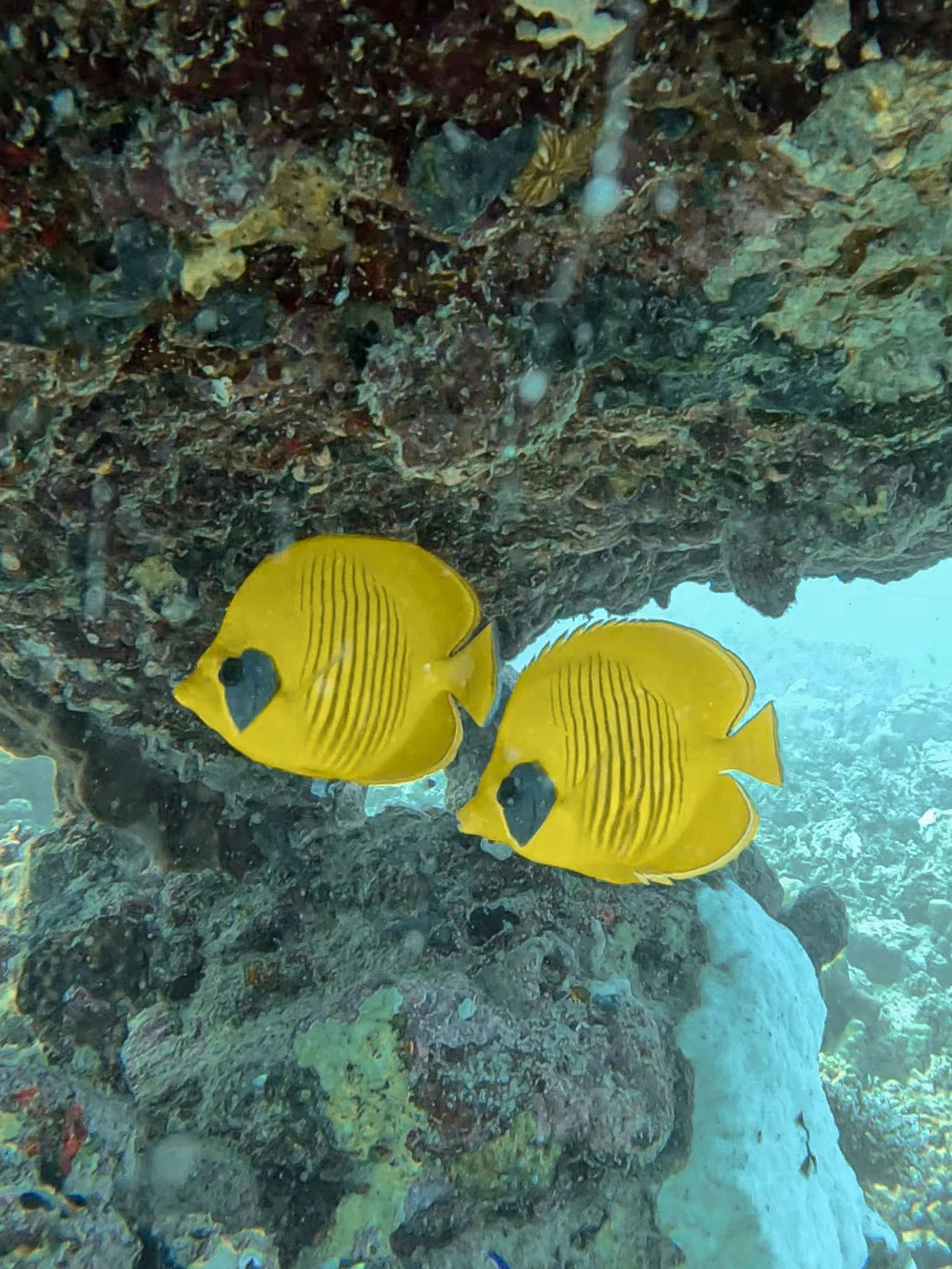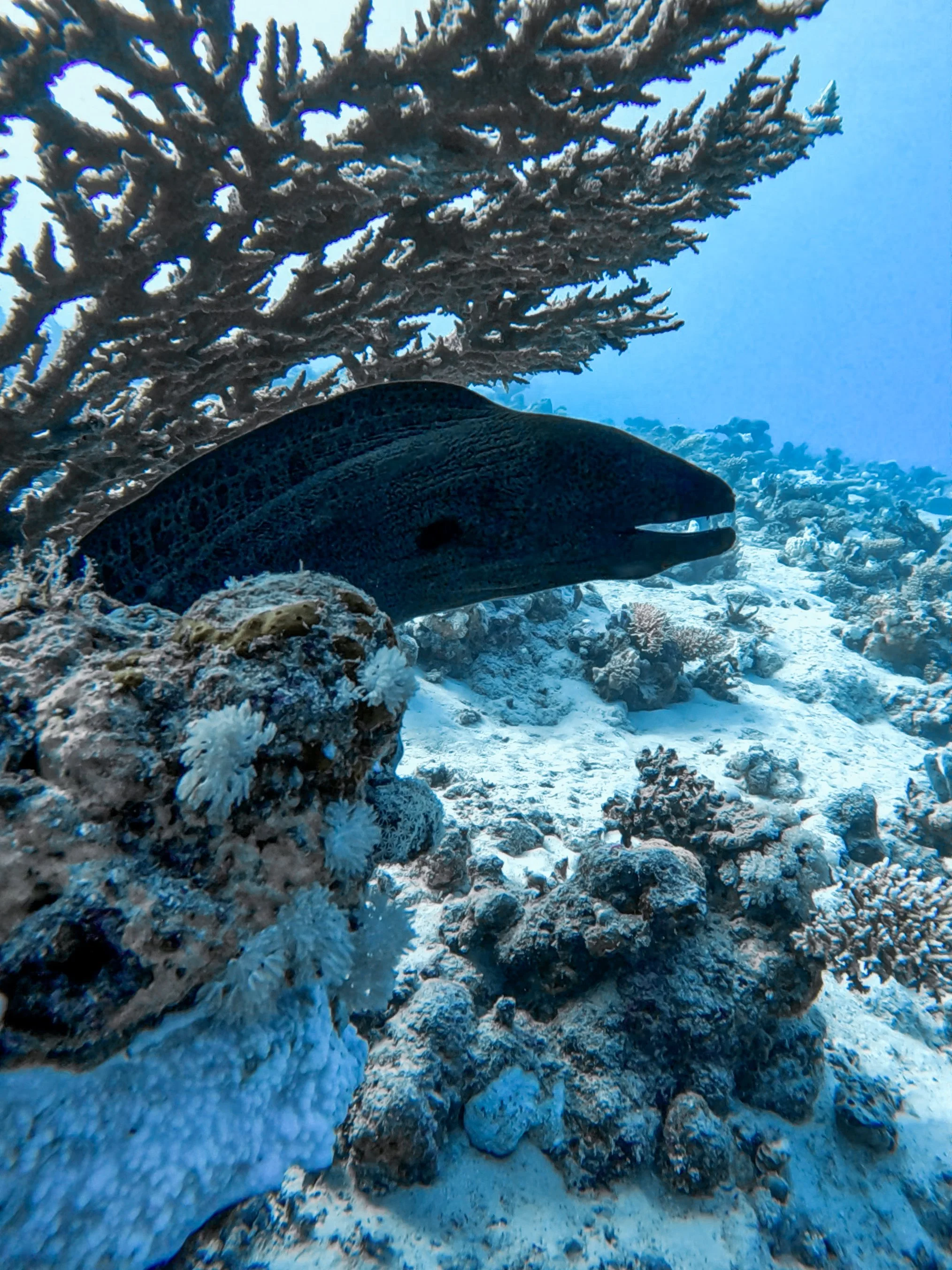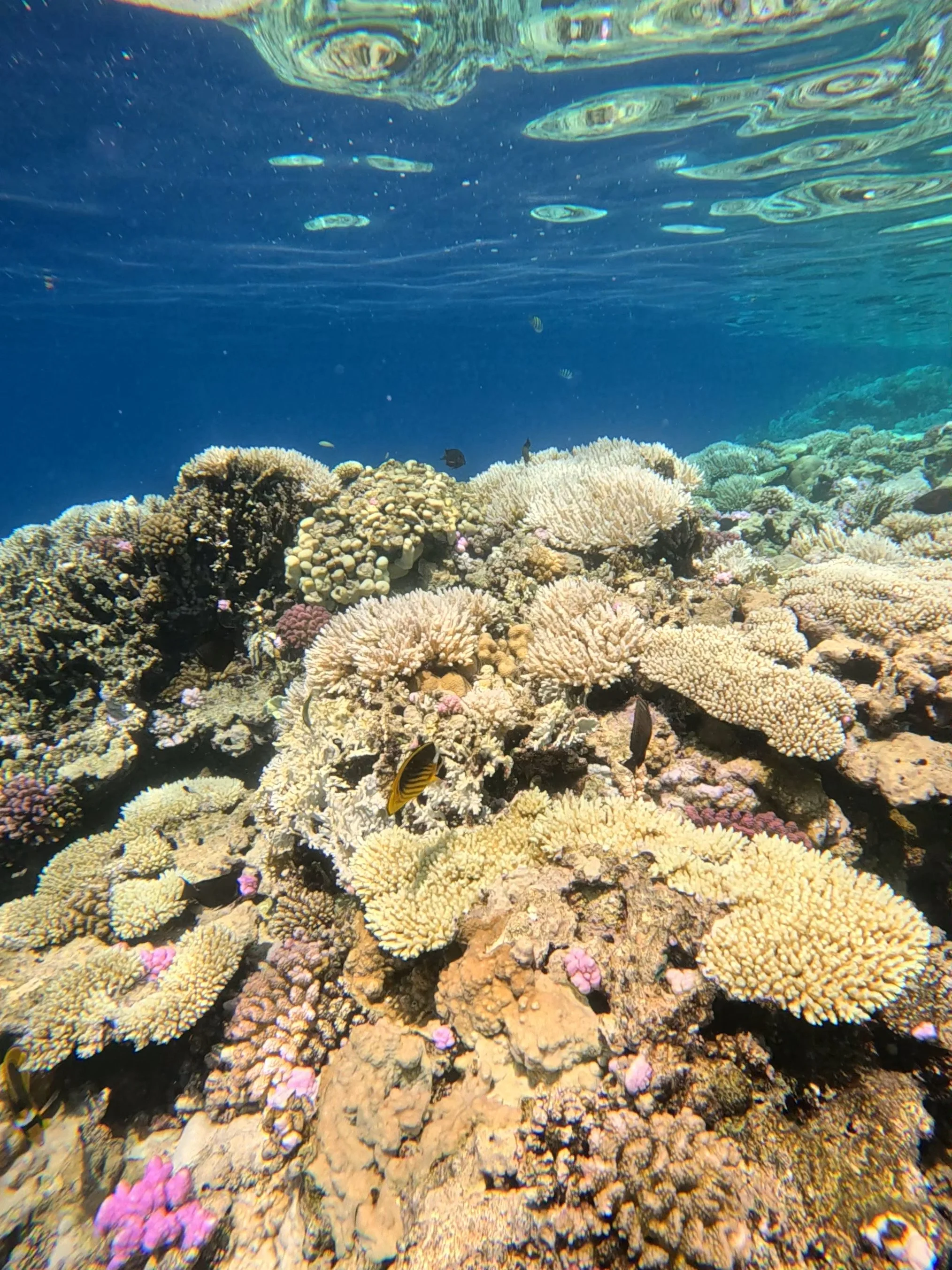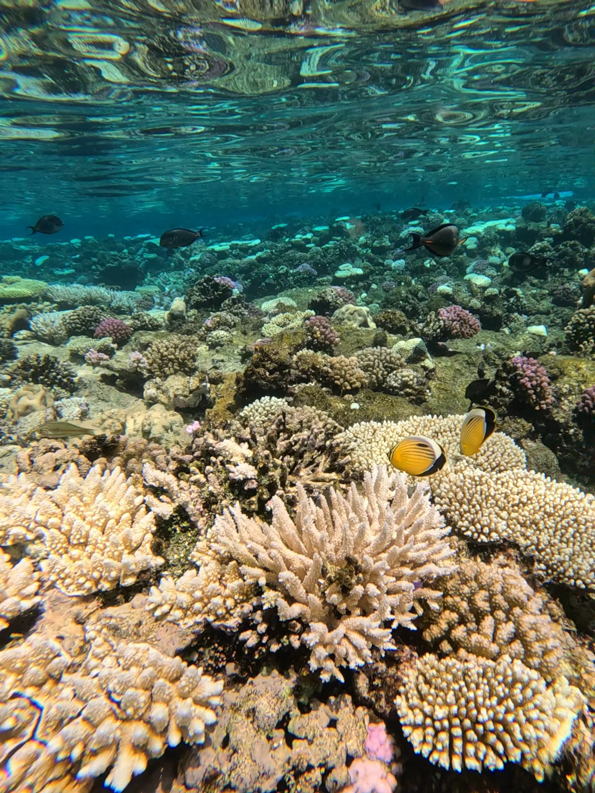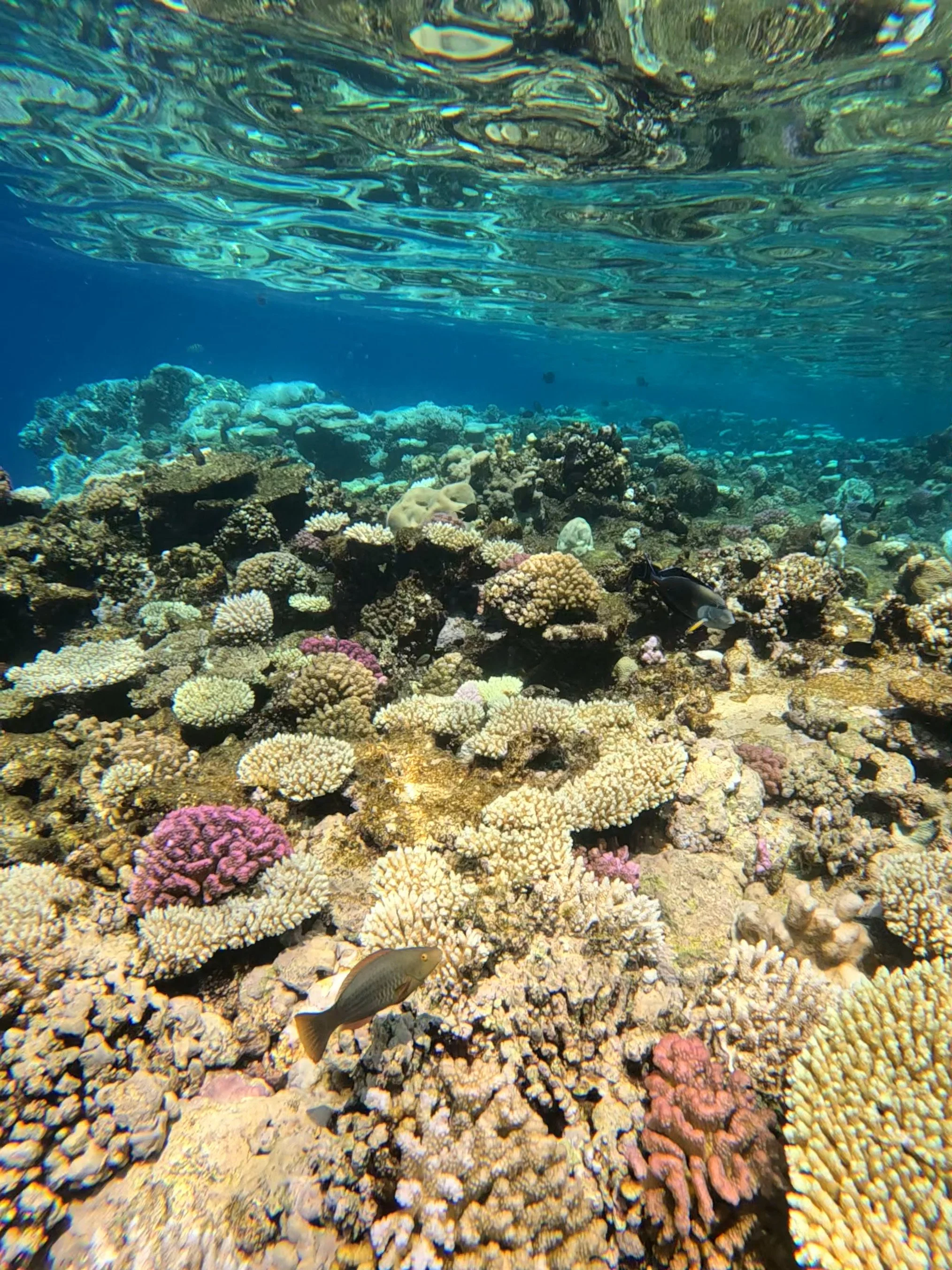 I woke up early today to get all my dive gear and do a check. Unfortunately, due to the wind and current at the time, my dive was canceled. I was told we would be able to go out the next morning. All the trips that were supposed to go out in the morning were also canceled due to the swells, and you could even look out and see that the liveaboards near the dive sites were struggling. I had no desire to be on one of those boats. In the afternoon, I was able to go out on a dingy with other divers who had just shown up. We descended into the water and found an ancient green sea turtle, blue spotted stingrays, and the same fish I was seeing in Saudi.