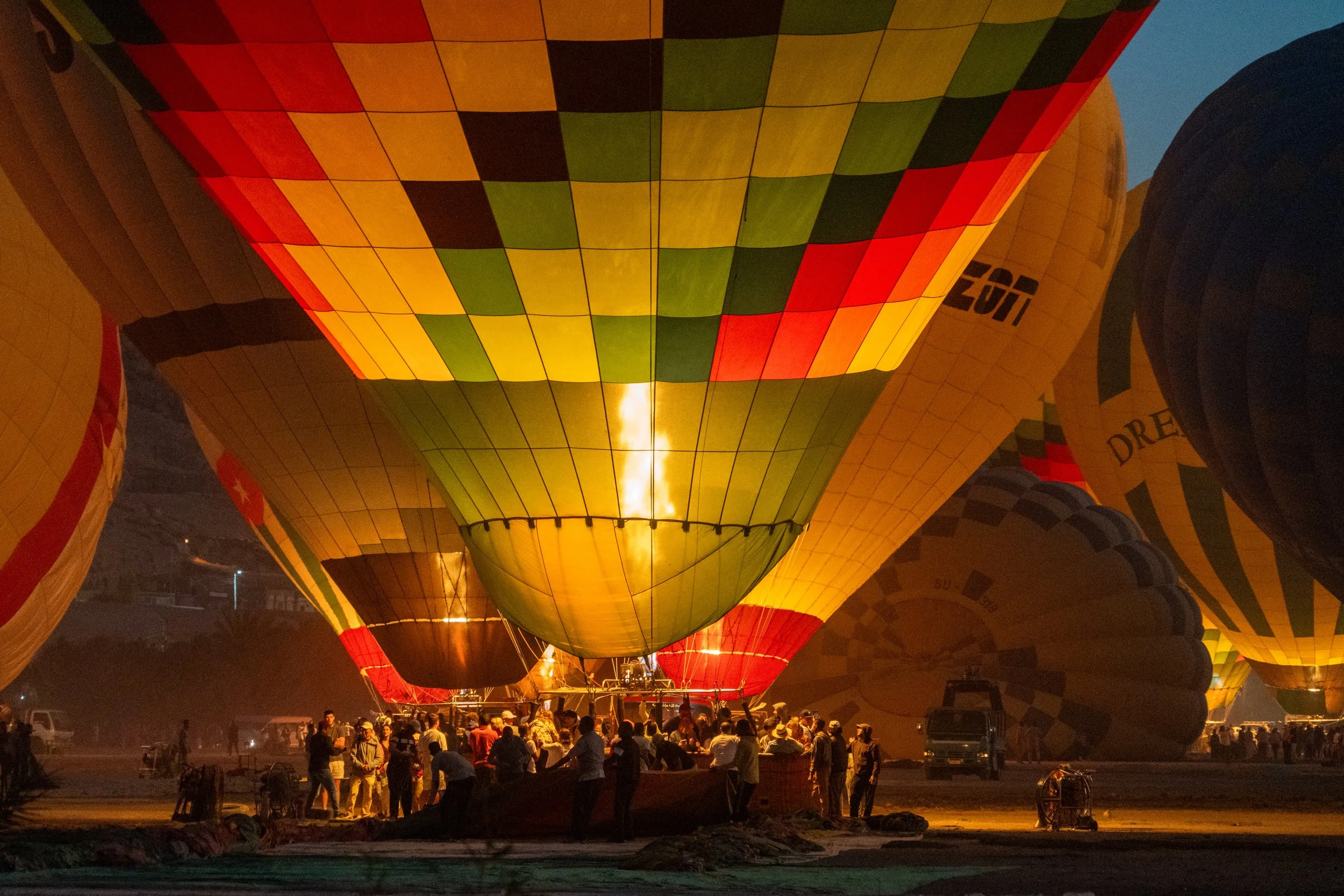 In the morning, we were picked up at our hotel and headed to the port. We took a boat to the other west bank of the Nile and got in another van there. Unfortunately, by this time, I had come down with the Egypt belly, so thankfully, one of the guys leading us helped me find a place to go to the bathroom. You will get food poisoning in Egypt—just a matter of time. We headed out to an open area where we could see all the fire from the staff filling the balloons with hot air. Just as the sky lit up, the balloons started rising.