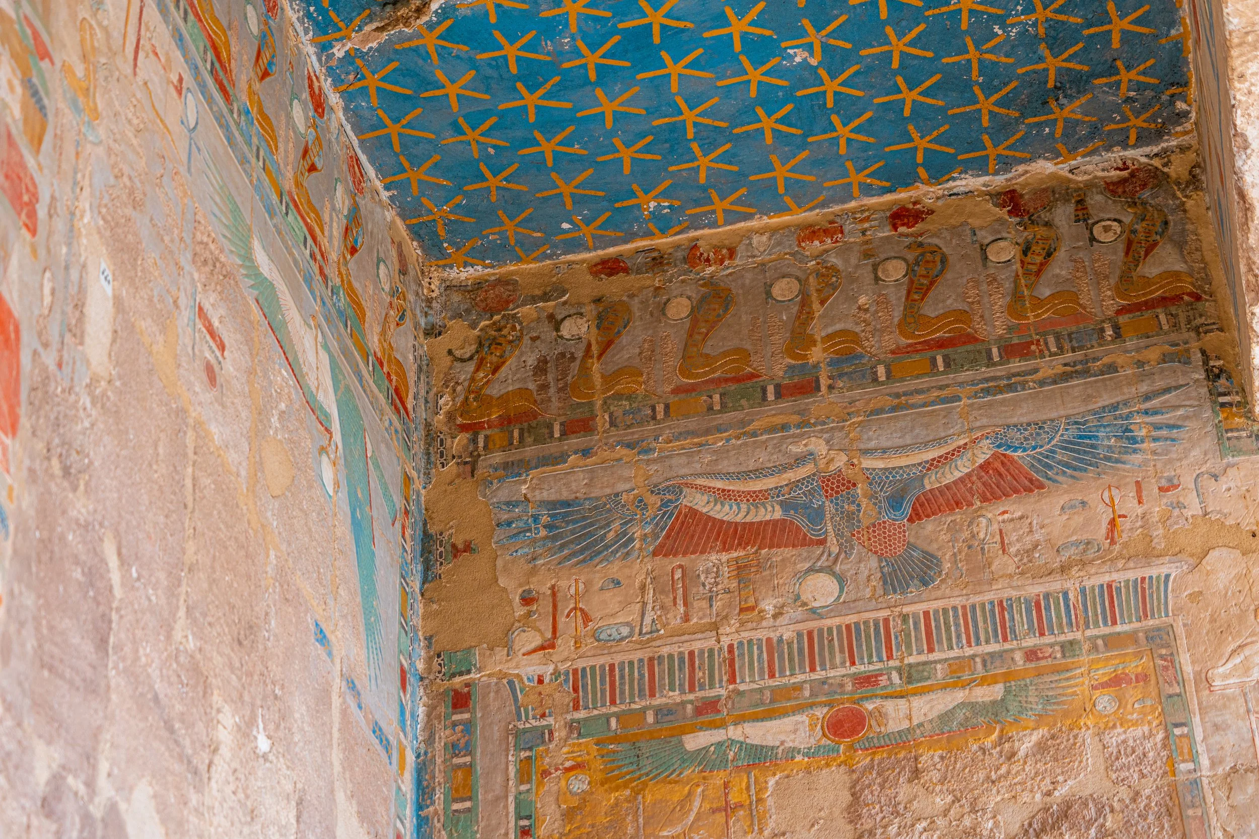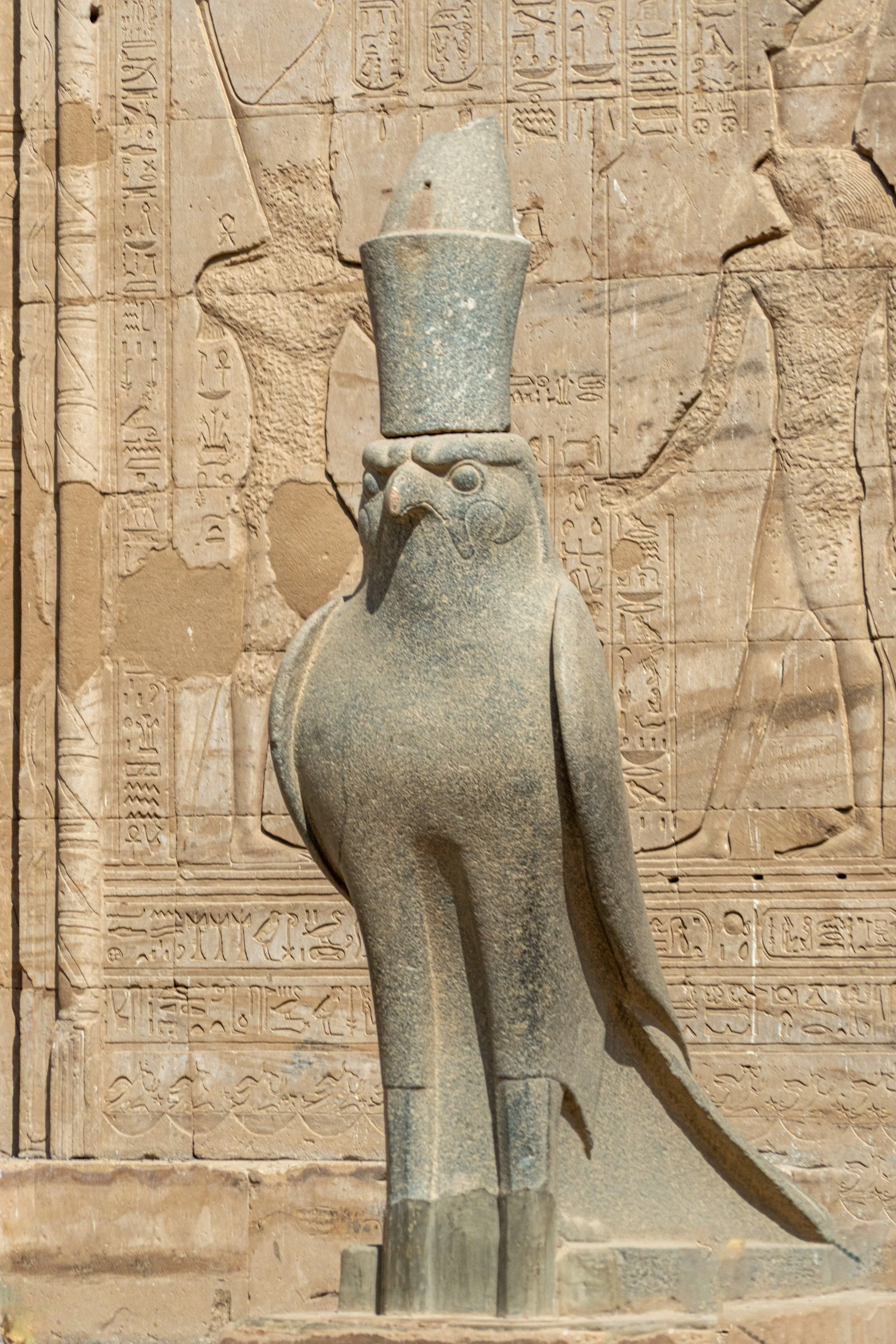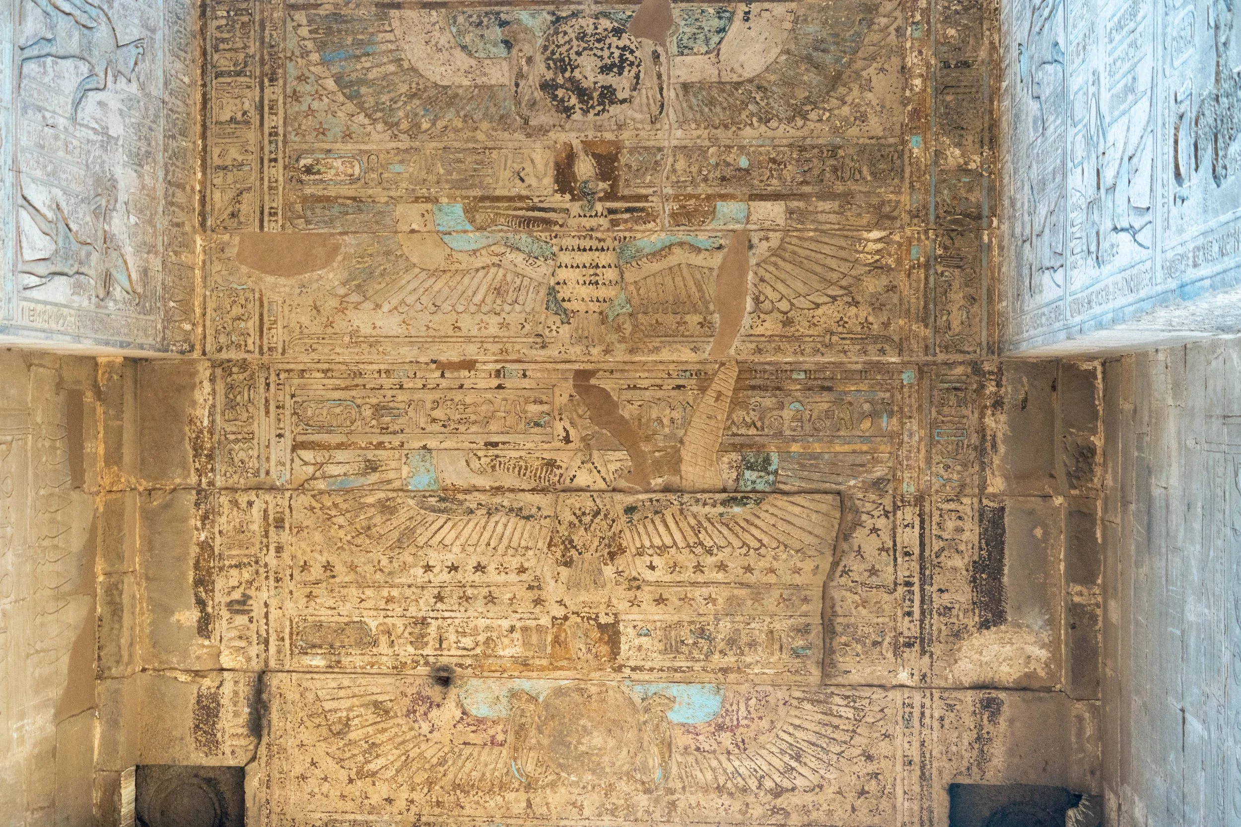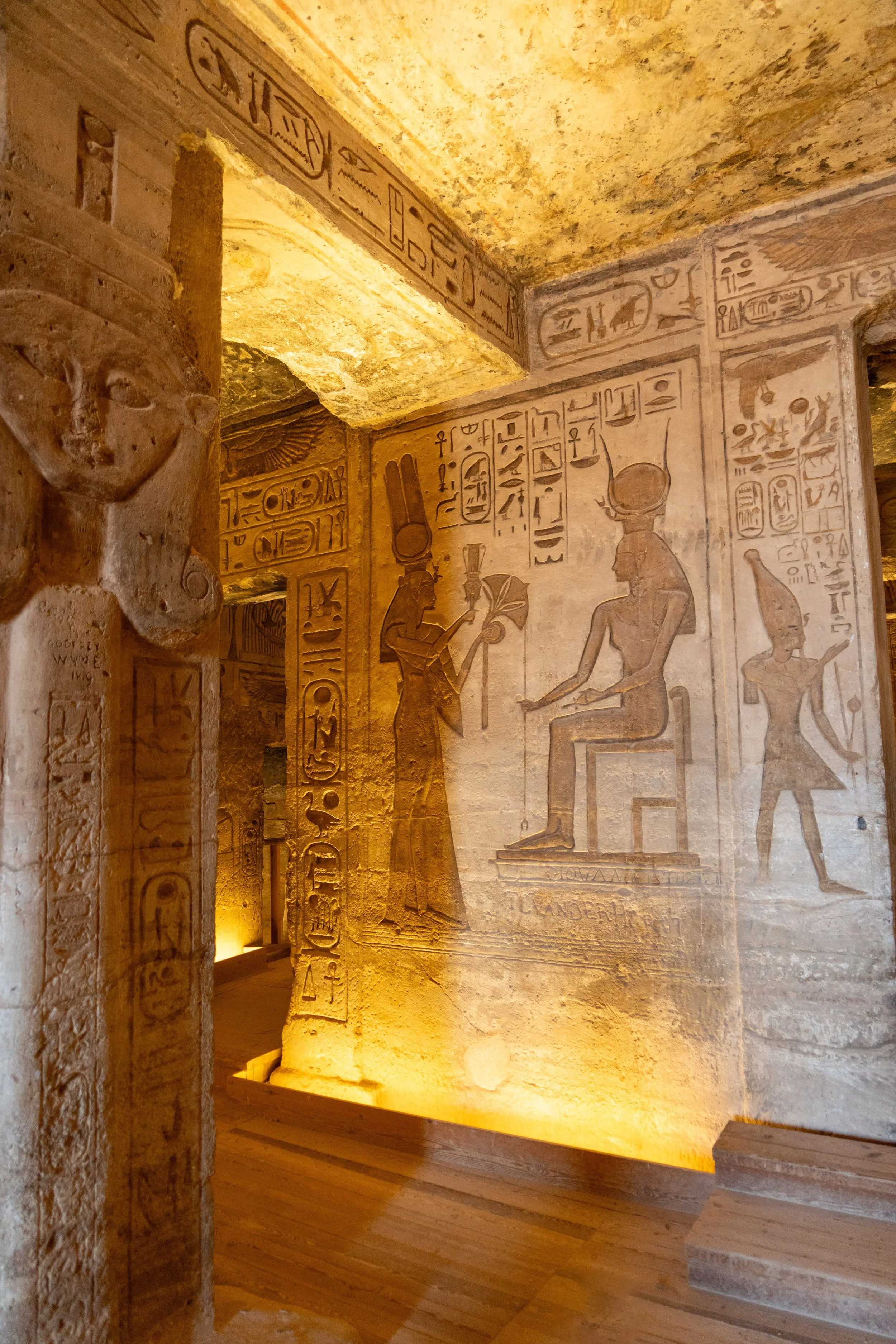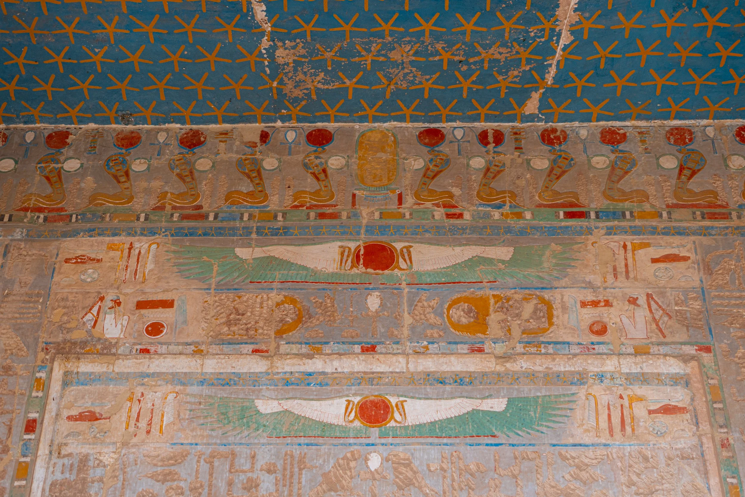 As you walk past the first walls, you come to the temple area where people in ancient times would give offerings, and then there were two statues of falcons representing Horus on either side of the deeper section of the temples. Each archway is always covered in Scarabs, which represents eternal life and good luck.
