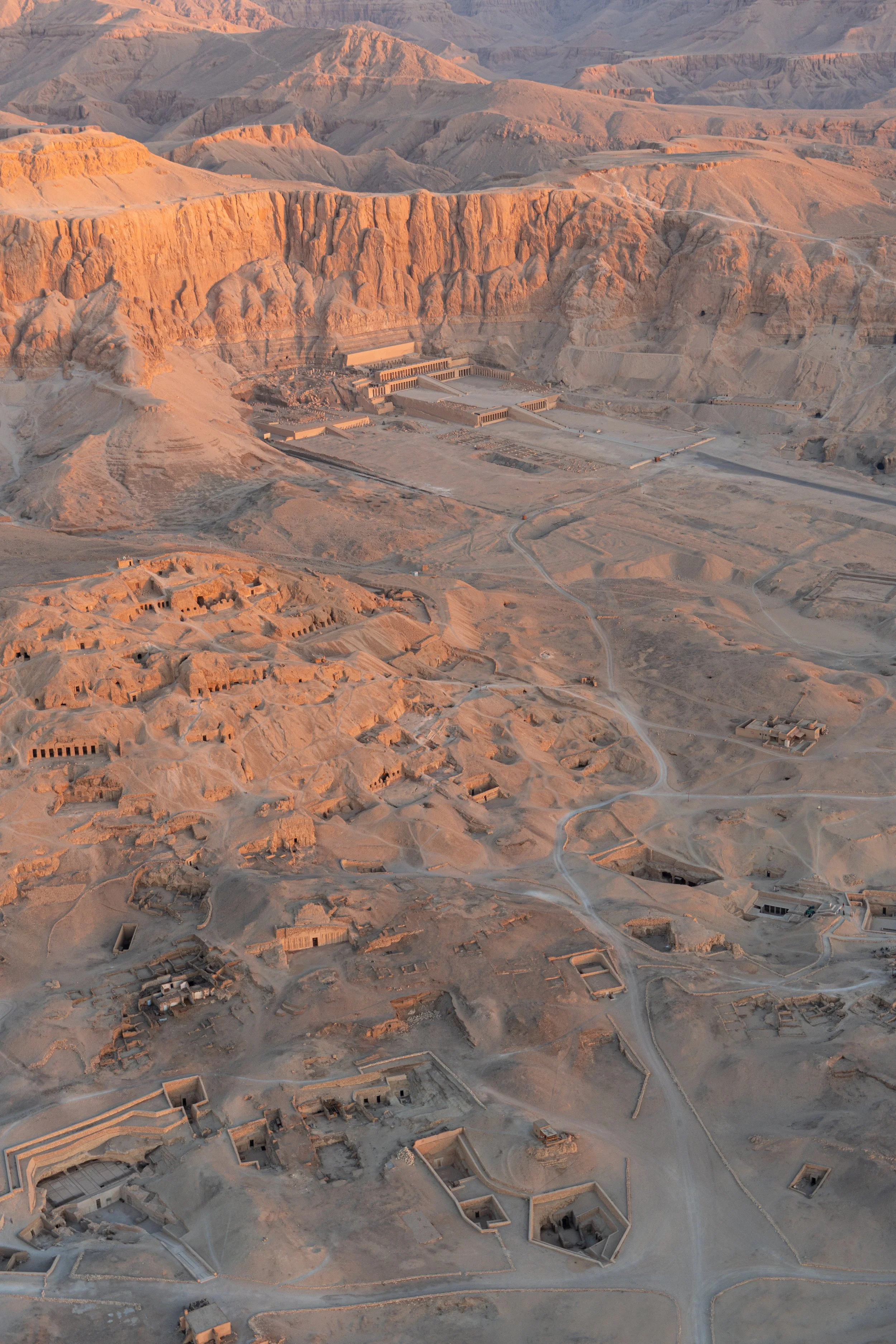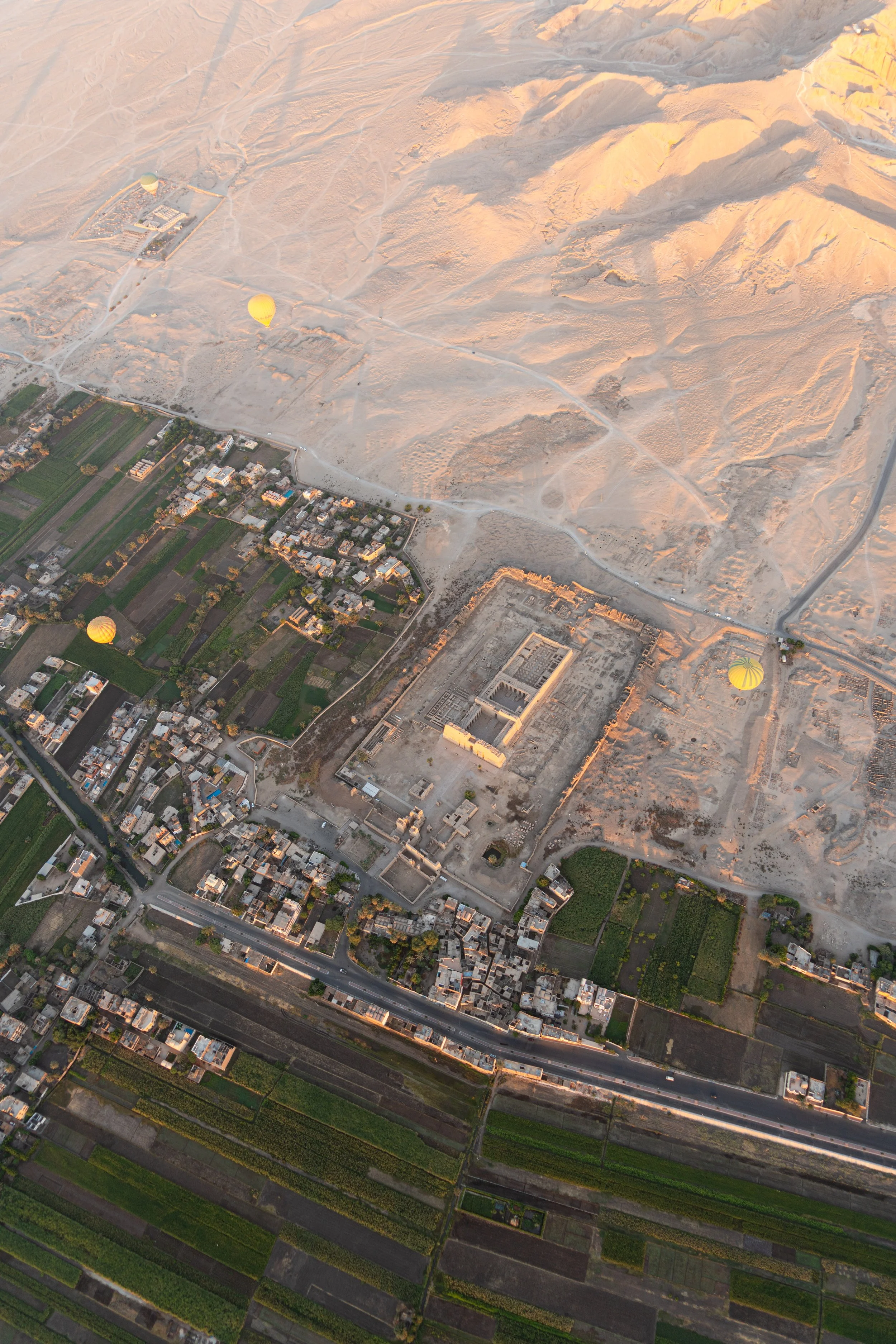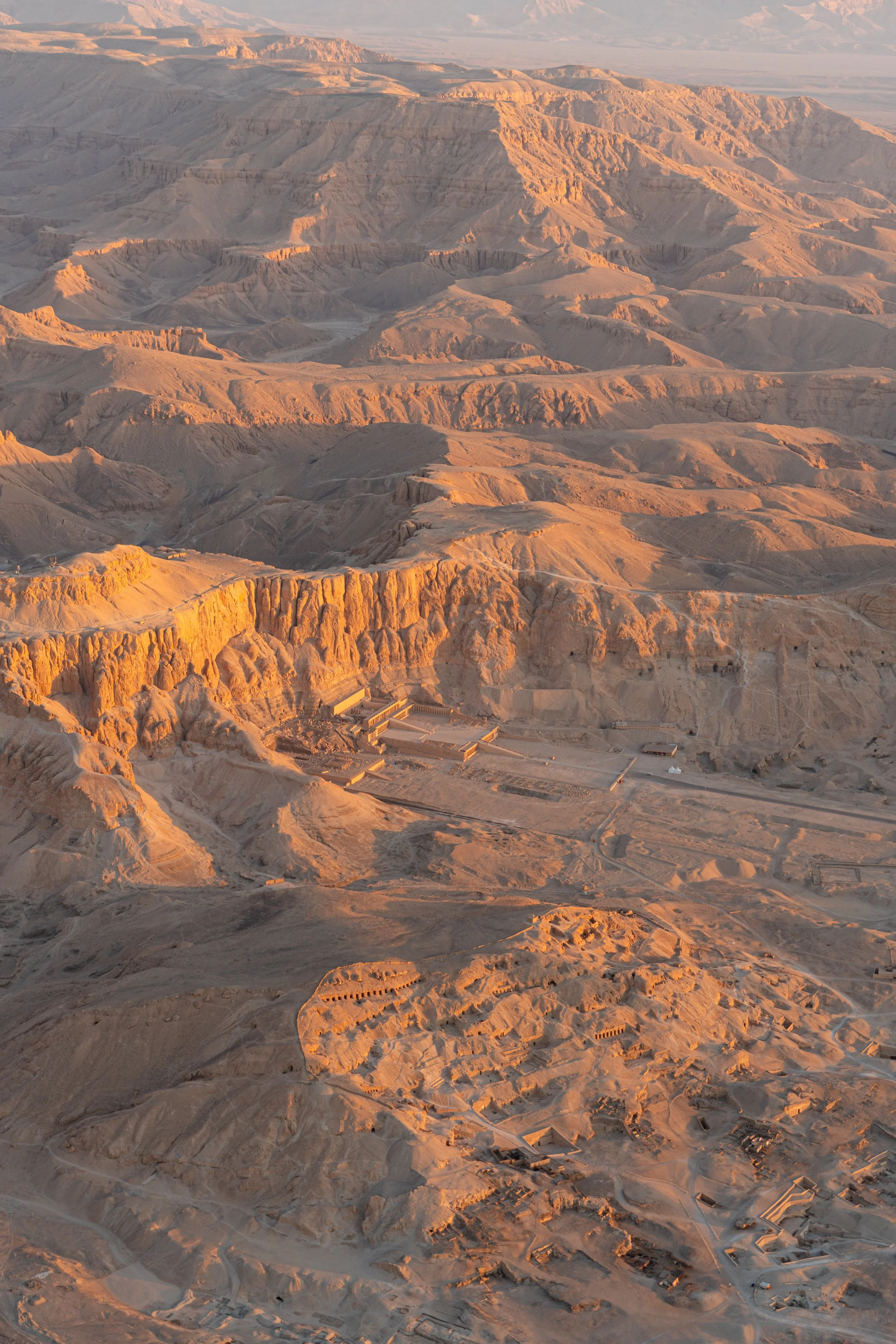 Egypt does not allow drones into the country, so this is the only way to get aerial photos. We floated over the temple complex, so getting that perspective was amazing. Then, the sun peeked over the horizon, casting that golden glow across the mountains and ruins.